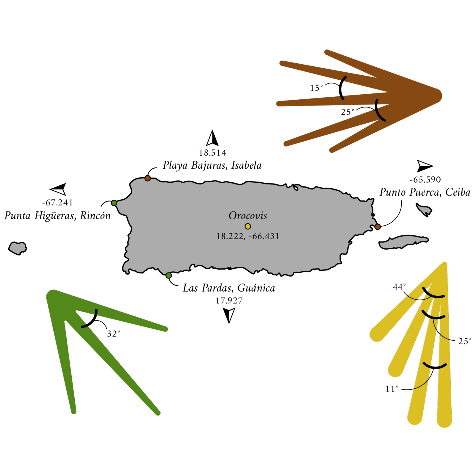 Para crear los símbolos, se juntaron entre tres y cinco unidades. Luego, cada unidad se rotó en torno a una unidad de referencia. Los grados de rotación de cada unidad se determinaron con una mezcla de sumas y restas usando los dígitos de las latitudes y longitudes (en grados decimales) de los puntos máximos hacia el norte, sur, este y oeste de Puerto Rico. También se incluyeron los grados decimales del centro geográfico en Orocovis. Cada color de los círculos en el mapa deja saber para cuáles ángulos se utilizó cada coordenada. Esta vez, el orden de operaciones de la matemática se lo dejamos a los que les interese descifrarla.