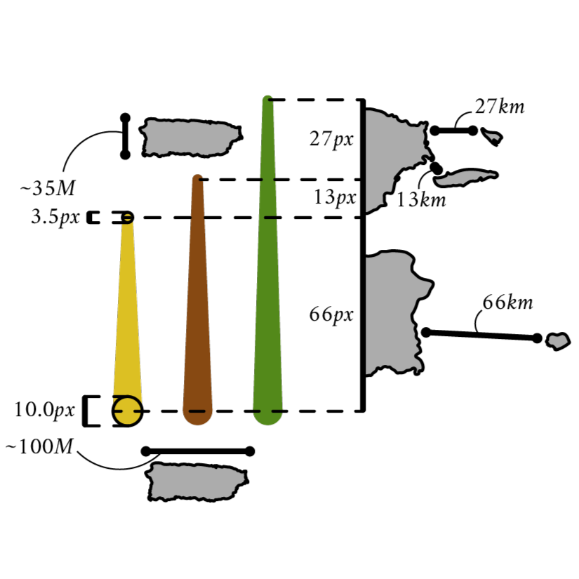 Las unidades que componen cada símbolo están en si compuestas de círculos y rectángulos con un lado grande y el otro chiquito. Los diámetros de los círculos se basan en las aproximadamente 100×35 millas (náuticas) que mide la isla. Y, como no nos podemos olvidar de las otras islas en nuestro arquipélago, las medidas de los rectángulos se calcularon usando la suma de las distancias entre Puerto Rico y cada isla en kilómetros.
